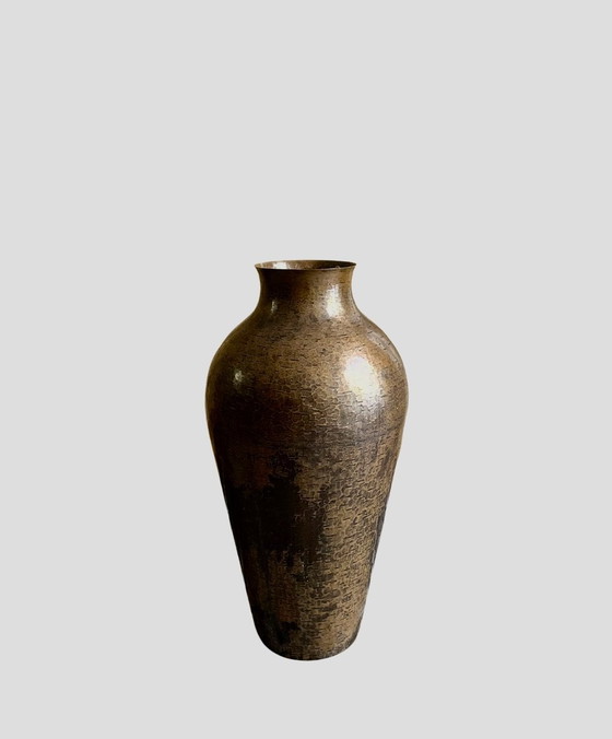 Grande vaso da terra in rame di Harald Buchrucker, realizzato a mano intorno al 1930. Questo imponente vaso da terra è un'opera unica, realizzata a mano dal rinomato artista tedesco del metallo Harald Buchrucker, risalente al 1930 circa. Realizzato in rame con la tradizionale tecnica della martellatura, il vaso colpisce per la sua eccezionale fattura e il design distintivo. La forma è elegante ed equilibrata: un corpo arrotondato e voluminoso, un collo incassato e un bordo leggermente rialzato conferiscono al vaso una silhouette armoniosa. La superficie è interamente decorata con un raffinato motivo martellato. Dimensioni: Altezza: 72,5 cm; Diametro (centro): 40 cm; Diametro (superiore): 18 cm; Punzone sul fondo.