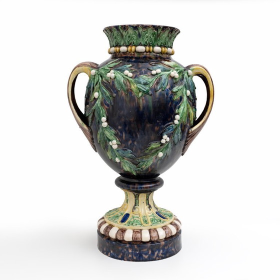 Realizzato su una base circolare, il vaso a balaustro con fondo marrone marmorizzato poggia. Il collo e il piede presentano motivi ispirati all'antichità classica con foglie d'acanto, spirali fogliate tra baccelli concavi. Dall'attacco superiore dei due manici, a forma di ramo molto stilizzato, si irradiano ramoscelli di alloro frondoso con bacche bianche in rilievo. Il tutto dipinto a mano nei tipici colori di Palissy.