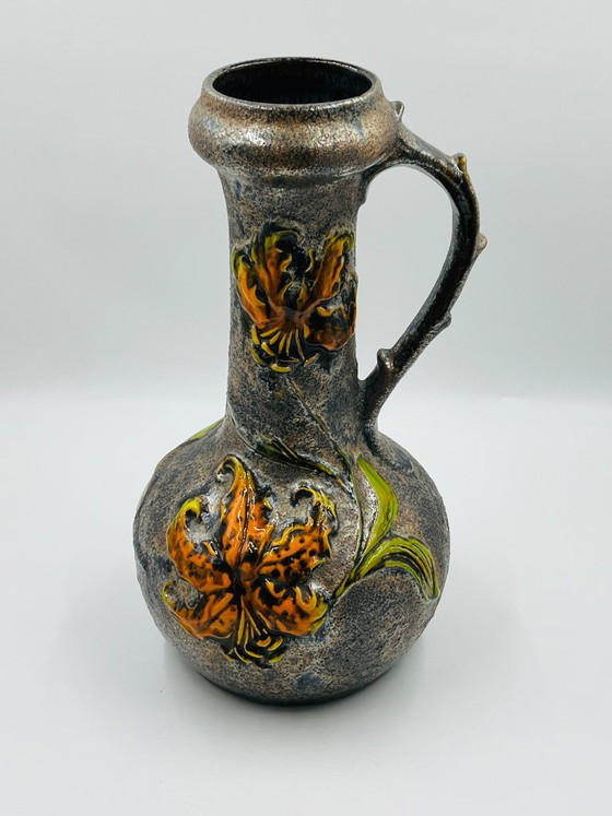Un pezzo splendido con manico scolpito e decorazioni floreali a rilievo, in una magnifica palette di colori grigio, arancione e verde screziati. Un oggetto di grande impatto e di forte valore decorativo, tipico del design ceramico della Germania Ovest di questo periodo.