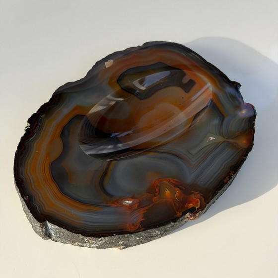 Ricavato da una spessa fetta di agata naturale a bande, ricavata da una geode brasiliana. La superficie interna è lucidata, mentre il bordo esterno rimane allo stato naturale, non lavorato. L'agata presenta bande nei toni del grigio, del marrone e del miele traslucido. Prodotto come oggetto decorativo alla fine del XX secolo, si presta bene come vassoio portagioie, contenitore portaoggetti o centrotavola.