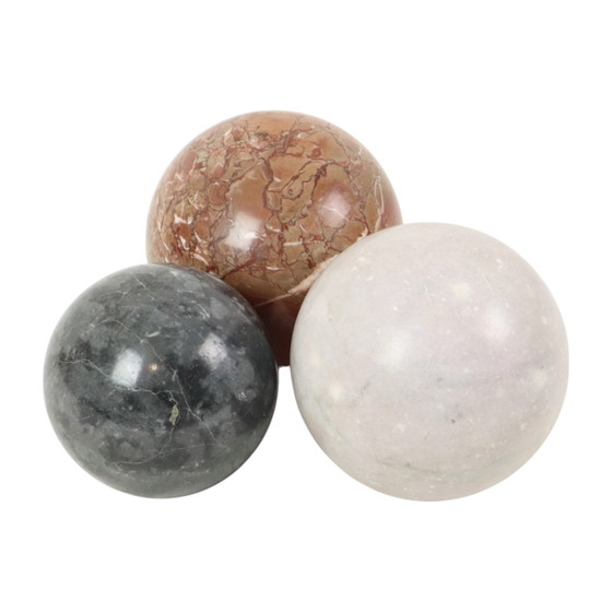 Set di 3 grandi sfere decorative lucidate, sfere in marmo massiccio o pietra naturale, gemme colorate con varie tonalità, seconda metà del XX secolo, banana per la scala. Queste sfere eccezionalmente grandi sono levigate e di alta qualità e decorative, le linee e i motivi naturali di ogni pietra sono davvero messi in risalto. Oggetti da collezione in queste grandi dimensioni! Si ritiene che alcune pietre abbiano proprietà curative. Oggetti pesanti e di alta qualità, fermacarte decorativi o un bel pezzo di decorazione. Queste bellissime sfere sono in ottime condizioni vintage. La sfera bianca presenta lievi segni di usura. Guarda le foto per maggiori dettagli! Dimensioni: 12 cm, 11 cm e 9 cm di diametro. Peso: 2,465 kg, 2,410 kg e 1,502 kg.