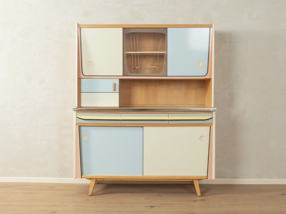 Delizioso mobile da cucina a due ante degli anni '50 dal design contemporaneo. Struttura di alta qualità in frassino impiallacciato con quattro ante scorrevoli, un'anta scorrevole in vetro, un'anta, tre cassetti, quattro ripiani e piedini inclinati. Progettato e prodotto in Germania.