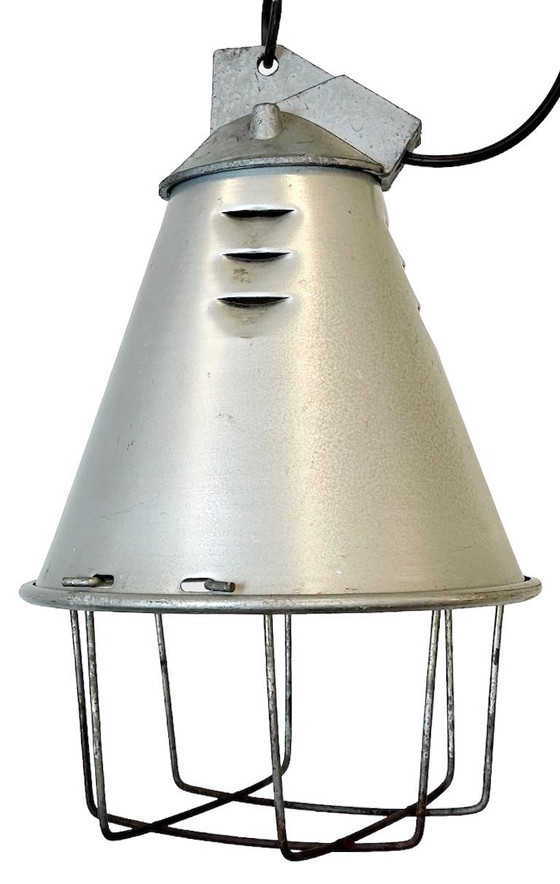 Industrial factory hanging lamp made by Polam Wilkasy in Poland during the 1970s. It features a grey aluminium shade, a cast aluminium top and an iron grid. The porcelain socket requires standard E 27/ E 26 lightbulbs. New wire. The weight of the lamp is 0,7 kg.
