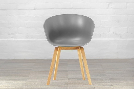 La sedia AAC22 combina una scocca avvolgente in materiale sintetico con una base in legno ed è progettata ponendo l'accento su comfort e sostegno.