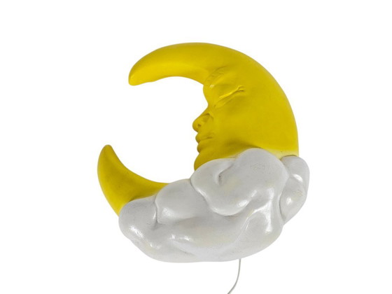 Lampada da parete retrò a forma di mezzaluna. Disegnata in giallo con un volto amichevole e situata su una nuvola bianca. Una lampada decorativa e distintiva.