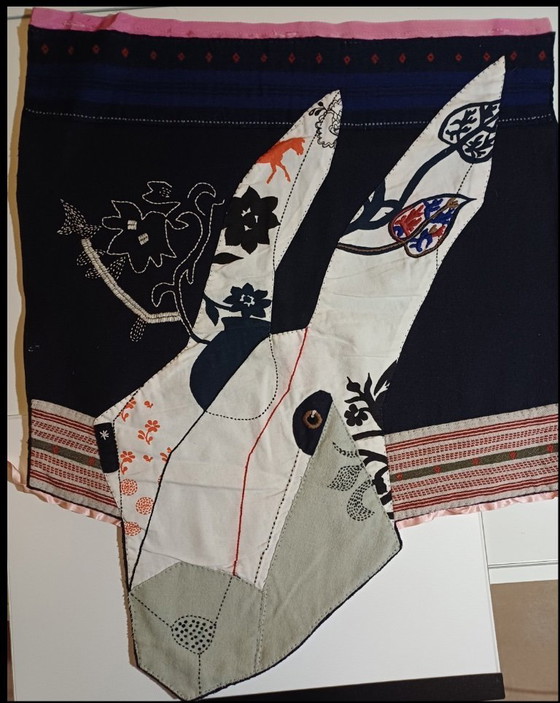 Arazzo da parete IKEA LP PELLE con motivo di coniglio e fiori su sfondo blu navy. Ispirato ai racconti del lontano nord. Creato dalla designer Hella Jongerius nel 2009. Numerato.