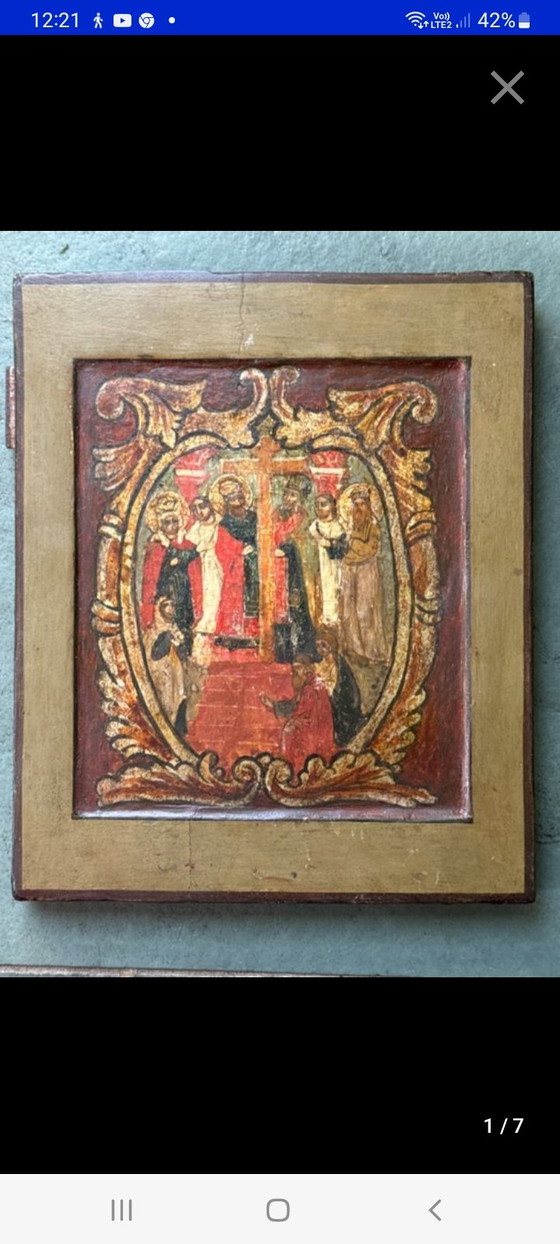 Questa magnifica icona, intitolata 'Esaltazione della Croce', è un'opera d'arte che cattura l'essenza della spiritualità e della tradizione religiosa. Con dimensioni di 22x20x2 cm, potrebbe essere stata parte di un'iconostasi più grande, arricchendo lo spazio con la sua presenza storica e simbolica.