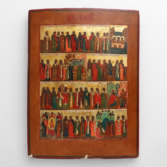 Un'icona russa del XIX secolo, splendidamente dettagliata, raffigurante i santi commemorati nel mese di marzo, meticolosamente disposti in più registri orizzontali. Ogni scena raffigura gruppi di figure sacre – martiri, vescovi, monaci e apostoli – su uno sfondo dorato luminoso che irradia calore spirituale e devozione.