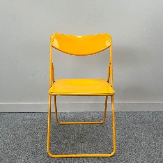 Sedie pieghevoli Ikea da mensa, gialle, con struttura in metallo, disegnate da Niels Gammelgaard negli anni '80. Funzionali e colorate, ideali per mense, eventi o come sedute aggiuntive in uffici o aree ricreative.