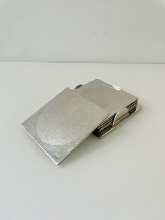 Eleganti sottobicchieri IKEA vintage, modello GROGGY. Questo set è composto da sei sottobicchieri quadrati in acciaio inossidabile, conservati in un supporto coordinato. Il design è minimalista e geometrico, con un sottile cerchio sulla superficie che aggiunge un tocco grafico.