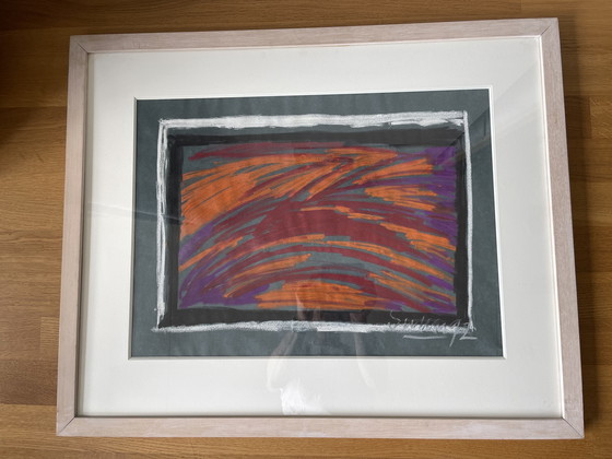 Opera a pastello incorniciata dal titolo "In memory" dello scrittore e poeta Simon Vinkenoog, realizzata nel 1992. L'opera presenta vivaci motivi astratti in arancione e viola su uno sfondo scuro. L'opera è elegantemente incorniciata e rappresenta un'aggiunta straordinaria a qualsiasi collezione d'arte.