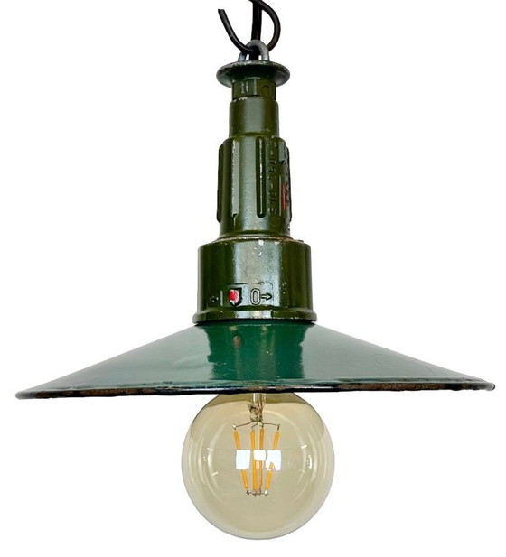 Industrial petrol enamel pendant light made in Poland during the 1960s. White enamel inside the shade. Green cast aluminium top. The socket requires standard E 27/ E26 light bulbs. New wire. The weight of the lamp is 0.5 kg.