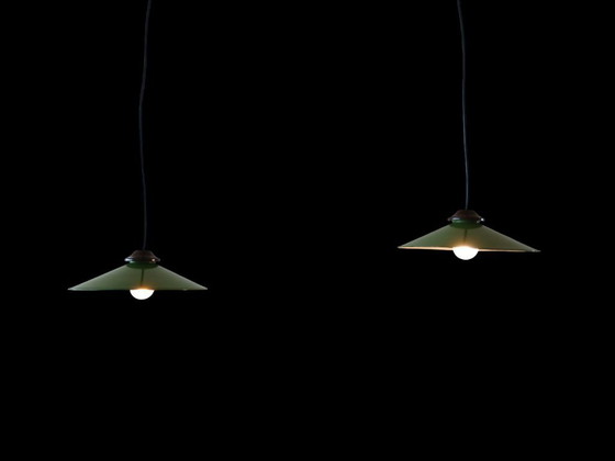 Paralumi in smalto verde/bianco con portalampada in bachelite.
