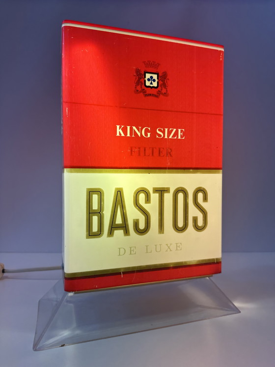 Insegna luminosa pubblicitaria vintage per tabacco/sigarette "Bastos". Modello da tavolo. In plastica. Originale. Lampada alogena. Interruttore sul cablaggio. Altezza: 33 cm. Larghezza: 25 cm. Profondità: 11 cm. Peso: 1,2 kg. Un lato presenta una leggera perdita di colore nella parte superiore (vedi foto). Numerata.