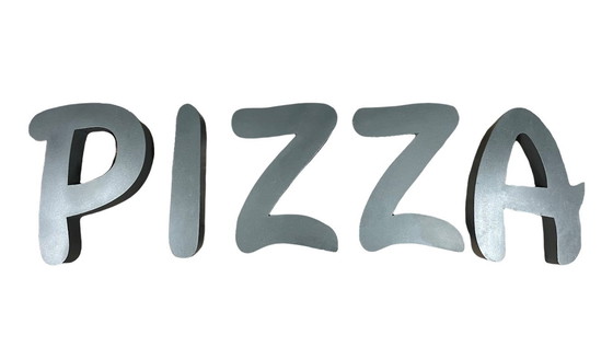 Scritta vintage industriale in ferro grigio "PIZZA". Set di cinque lettere realizzate negli anni '70 in Italia.