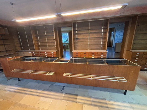 L'interno è stato realizzato su misura da un ebanista e rappresenta un esempio eccezionale di falegnameria commerciale moderna di metà secolo: funzionale, architettonicamente strutturato e dal design senza tempo.