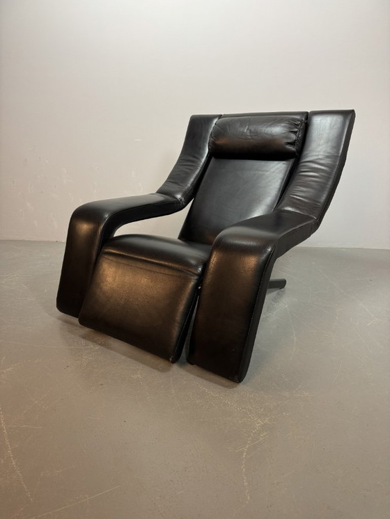 Iconic ‘Kilkis’ leather lounge chair designed by Titina Ammannati and Giampiero Vitelli for Brunati. Upholstered in black leather, this Italian design features an extendable lower section that transforms the chair into a full relaxation lounger. The chair includes an attachable side table mounted to the armrest, enhancing both comfort and functionality. Dimensions: Height 90 cm, Width 90 cm (110 cm incl. side table), Depth 100 cm (120 cm extended), Seating Height 37 cm, Arm Rests 45 cm