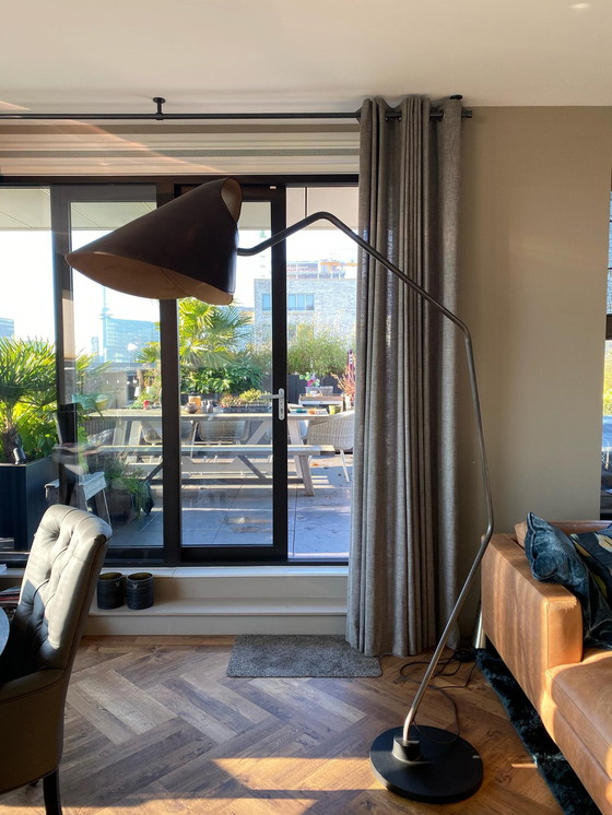 Jacco Maris Mrs Q stoere vloerlamp. De robuuste dark brown leren kap in combinatie met de zorgvuldig gekozen ontworpen stalen staander vormen het karakter van deze charmante dame.