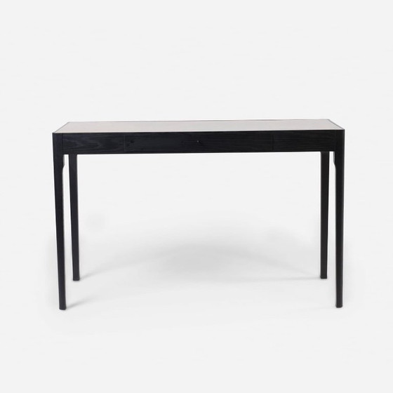 Scrivania con piano in ottone dello studio di design sudafricano James Mudge. Rovere trattato con olio nero e piano in ottone dorato.