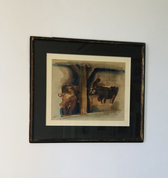 Jean Timmermans (1899-1986) - Mucche e contadino nella stalla Acquerello - Firmato a mano - 1930