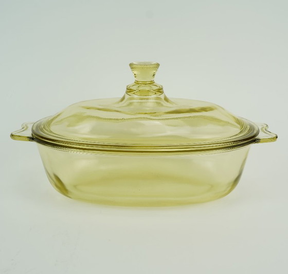 Ciotola/teglia da forno, basata su un progetto di Wilhelm Wagenfeld del 1933-35 per Schott & Gen. Prodotta in una forma leggermente modificata negli anni '50 nell'ex DDR. Marchio: Jenatherm. Realizzata in vetro borosilicato resistente al calore, che presenta una leggera colorazione giallastra in determinate condizioni di illuminazione. Marchiata Jenatherm sul fondo, 3052 sul manico e D 3052 D sul coperchio.