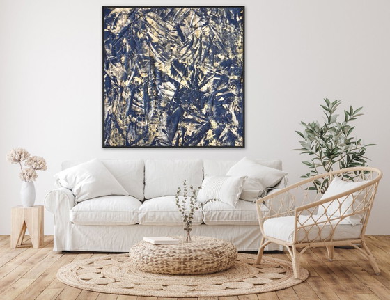 Il dipinto misura 115 x 115 cm e presenta i margini necessari su ogni lato per essere montato su un telaio di 100 x 100 cm. Spessore del telaio consigliato: 2–5 cm.
