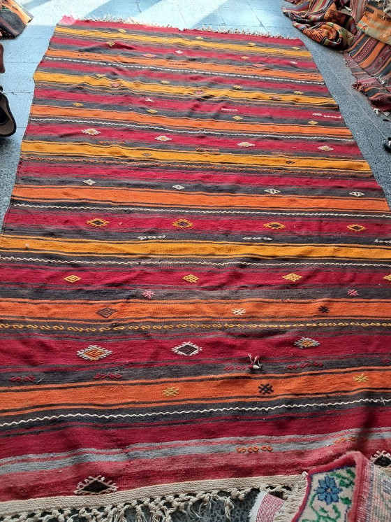 Questo è un autentico kilim turco semi-antico, tessuto a mano secondo tecniche tradizionali praticate da generazioni in Anatolia. Realizzato interamente a mano su telaio, questo kilim riflette il patrimonio culturale, il simbolismo e l'artigianato delle tradizioni tessili rurali turche.