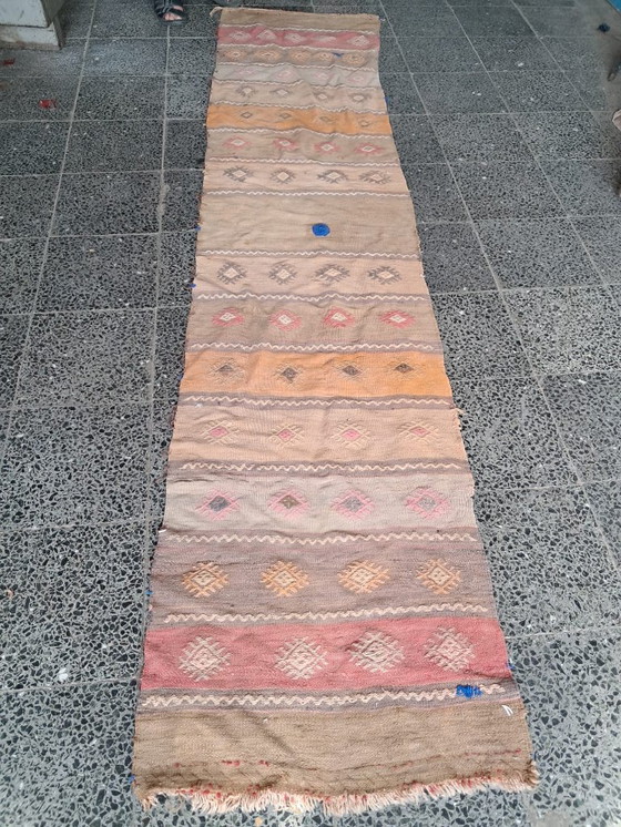 Questo è un autentico kilim turco semi-antico, tessuto a mano secondo tecniche tradizionali praticate da generazioni in Anatolia. Realizzato interamente a mano su telaio, questo kilim riflette il patrimonio culturale, il simbolismo e l'artigianato delle tradizioni tessili rurali turche.