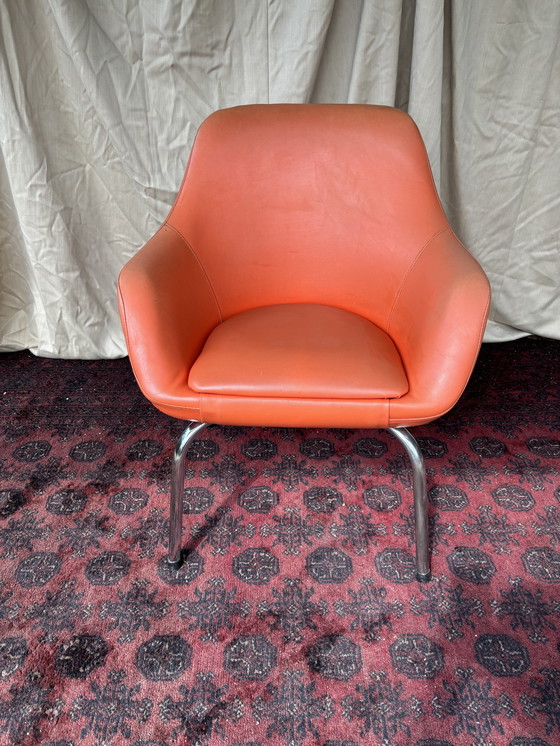 Questa poltrona vintage di metà secolo è un pezzo straordinario che incarna il design classico dell'epoca. Caratterizzata da un vivace rivestimento in pelle arancione, offre comfort e stile. La poltrona è sostenuta da eleganti gambe in metallo, che aggiungono un tocco moderno alla sua estetica retrò. Perfetta per aggiungere un tocco di colore a qualsiasi ambiente, questa sedia è un ottimo esempio di design moderno di metà secolo. Nonostante i lievi graffi sulle gambe, è in ottime condizioni, pronta a valorizzare il vostro spazio abitativo.