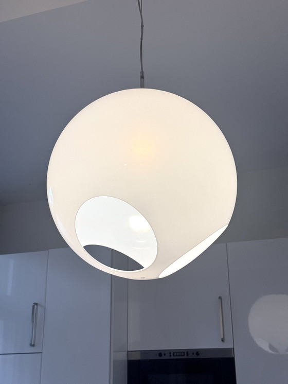 Kundalini Noglobe 50 è una lampada a sospensione di design italiano, disegnata da Marzip Rusconi e Laura Agnoletto. La lampada è realizzata in acrilico bianco con finiture in cristallo e presenta 3 cerchi tagliati al laser. Riesce a essere contemporanea ma anche a richiamare il design retrò degli anni Settanta. Offre un'estetica contemporanea adatta a vari stili di interni. La lampada è in ottime condizioni.