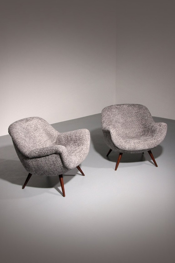 Questa poltrona eccezionale e rara fu progettata da Gustav Bergmann e prodotta dalla sua azienda a Lippe, in Germania, nei primi anni '60. Le linee organiche e arrotondate conferiscono alla sedia un aspetto sorprendente e al tempo stesso invitante. La seduta e i braccioli angolati ne esaltano la qualità architettonica e dinamica, mentre le gambe affusolate e orientate verso l'esterno sono realizzate in legno massello di faggio, rifinito con una ricca tinta marrone scuro.