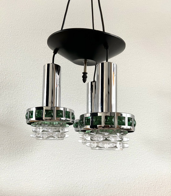 Bellissima lampada a sospensione vintage di Massive, spesso attribuita a Raak Amsterdam. La lampada a cascata è composta da 3 lampadine separate ed è realizzata in plastica, cromo, vetro e metallo. La lunghezza dei 3 cavi è regolabile a piacere, ad esempio su 3 diverse lunghezze. Questo rende la lampada adatta non solo sopra il tavolo da pranzo, ma anche in una tromba delle scale o in un corridoio alto.