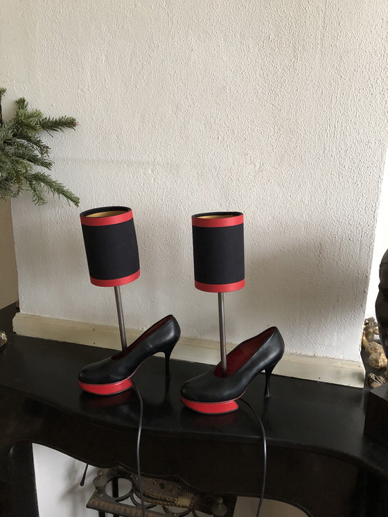 Lampade d'artista realizzate con scarpe inutilizzate. Per illuminazione decorativa e d'atmosfera. Il paralume non è perpendicolare alla scarpa, ma leggermente inclinato in avanti nella direzione di camminata.