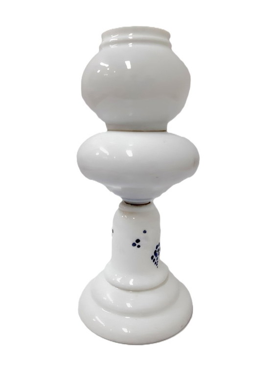 Fate un salto indietro nel tempo con questa squisita lampada a olio francese in porcellana antica, testimonianza di un'eleganza e di una maestria senza tempo. Questa lampada, con il suo delicato corpo in porcellana impreziosito da delicati accenti blu, evoca un senso di raffinata raffinatezza, perfetta per aggiungere un tocco di fascino vintage a qualsiasi ambiente.