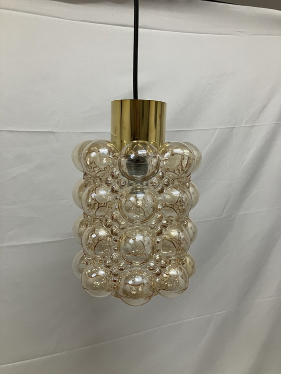 Illumina il tuo spazio con la splendida lampada a sospensione Helena Tynell, un capolavoro di Limburg Glashütte. Questo splendido pezzo presenta un accattivante design in vetro a bolle che diffonde magnificamente la luce, creando un'atmosfera calda e accogliente. L'elegante struttura in ottone aggiunge un tocco di raffinatezza, rendendola un'aggiunta perfetta a qualsiasi interno moderno di metà secolo.