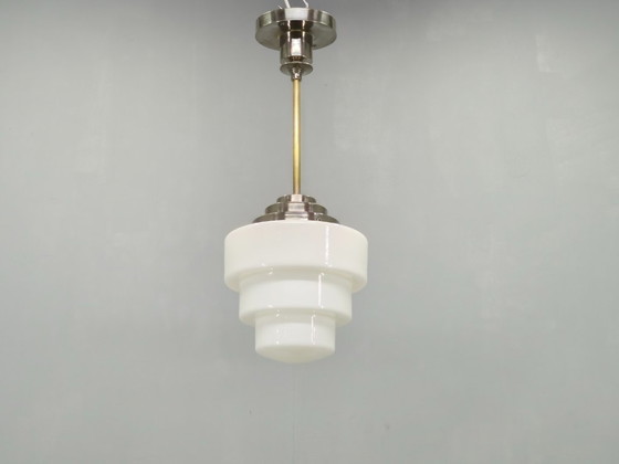 La lampada presenta un paralume in vetro opalino splendidamente decorato a gradini, abbinato a elementi in metallo nichelato e ottone. La forma geometrica a strati riflette la forte estetica architettonica tipica del periodo Art Déco.