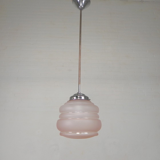 Lampada a sospensione Art Déco con paralume in vetro rosa, anni '30