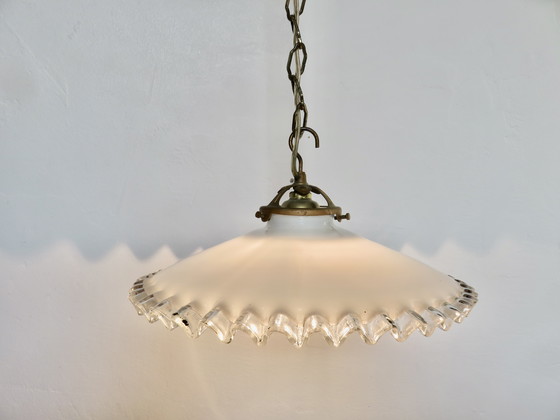 Lampada a sospensione Art Déco in vetro seghettato, anni '30. Diametro 25,5 cm. Altezza 13 cm. Altezza con catena 31 cm. Attacco a vite grande E27. Funziona perfettamente. Patina e segni dovuti al tempo.