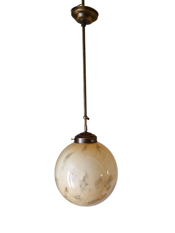 Lampada a sospensione in stile Art Déco marmorizzato in ottone e vetro opalino marmorizzato.
