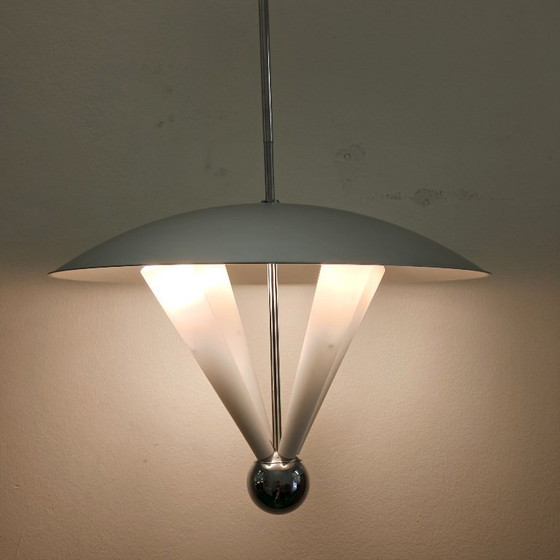 Lampada a sospensione molto particolare di Artemide chiamata Kalea, disegnata da Vico Magistretti negli anni Novanta. La lampada è ancora in buone condizioni vintage. Purtroppo, un pezzo di una delle parti in vetro si è rotto. Il grande paralume presenta alcuni graffi nella parte inferiore, ma per il resto è ancora buono. La lampada è stata lucidata e controllata e tutto funziona come dovrebbe.