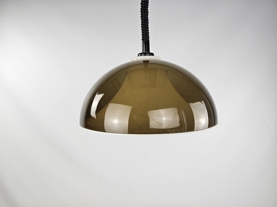 Questa lampada a sospensione di Elio Martinelli per Artimeta è uno splendido esempio di design moderno di metà secolo. Caratterizzata da un elegante paralume in plastica marrone e da un paralume interno bianco, aggiunge un tocco di eleganza a qualsiasi ambiente. Il design minimalista e i materiali di alta qualità della lampada la rendono un pezzo senza tempo, perfetto per chi apprezza lo stile classico con un tocco moderno. Ho anche una lampada da terra simile. Vedi i miei altri annunci per maggiori dettagli.