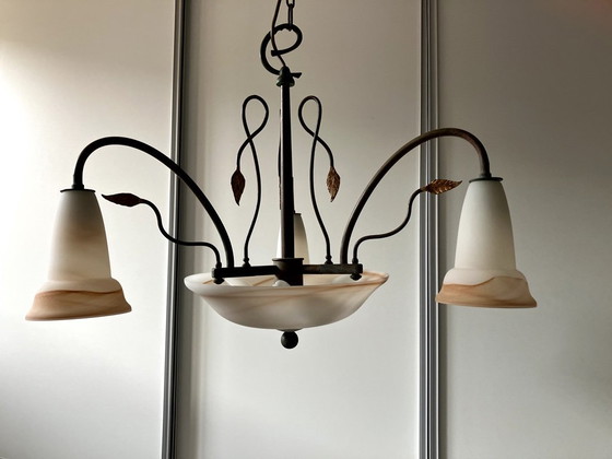 Questa lampada Falb è della collezione Butterfly (Artnr. RO767-05), è stata progettata nei primi anni '90 in Toscana dal designer Sergio Falb e realizzata in metallo, ottone e vetro alabastro. L'altezza della lampada è di 55 cm e la larghezza massima di 76 cm, il diametro della ciotola centrale è di 35 cm e ha un'altezza di 8 cm, i tre calici hanno un diametro massimo di 13 cm e sono alti 16 cm. Gli attacchi utilizzati sono E14.