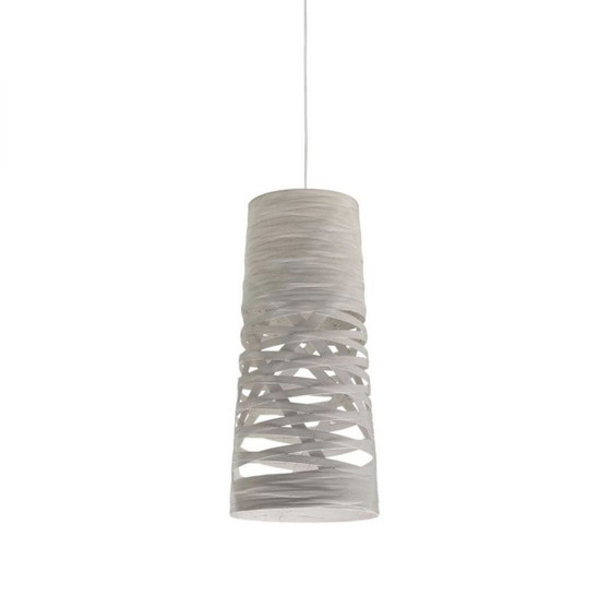 Illumina il tuo spazio con l'elegante lampada a sospensione FOSCARINI TRESS. Questo capolavoro moderno presenta un esclusivo design intrecciato che proietta intriganti giochi di luce e ombra, creando un'atmosfera calda e accogliente. Realizzata con materiali tessili di alta qualità, la sua elegante finitura bianca si adatta a qualsiasi arredamento contemporaneo.