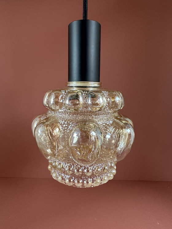 Splendida lampada in vetro a bolle di Helena Tynell. Dotata di portalampada, filo e spina nuovi. Altezza, portalampada incluso: 21 centimetri. Diametro: 16 centimetri.