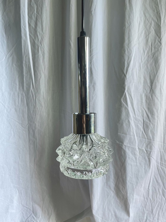 Piccola lampada a sospensione cromata e in vetro spesso stampato. Anni '70, stile modernista/space age di metà secolo.