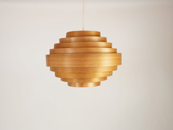 Lampada a sospensione vintage in legno di pino, dal tipico design scandinavo degli anni '70, ispirata a Hans-Agne Jakobsson. La lampada presenta lievi danni in due punti (vedi foto), ma per il resto è in buone condizioni, usata.