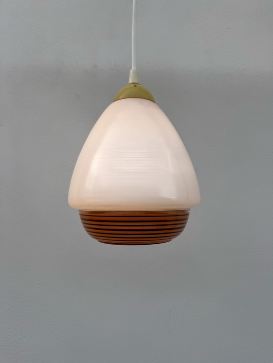 Lampadario/lampadario a sospensione in vetro policromo bianco e marrone in stile scandinavo anni '60/'70; ottime condizioni generali; per lampadine a baionetta (necessario coprifilo a soffitto)