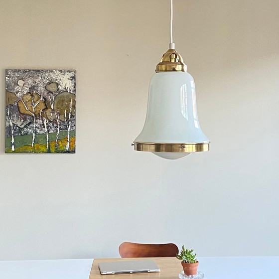 Lampada a sospensione in vetro opalino bianco e ottone, il globo è chiuso nella parte inferiore.