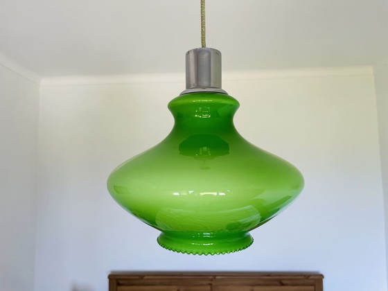 Lampada a sospensione in vetro opalino verde della modernità di metà secolo 1970