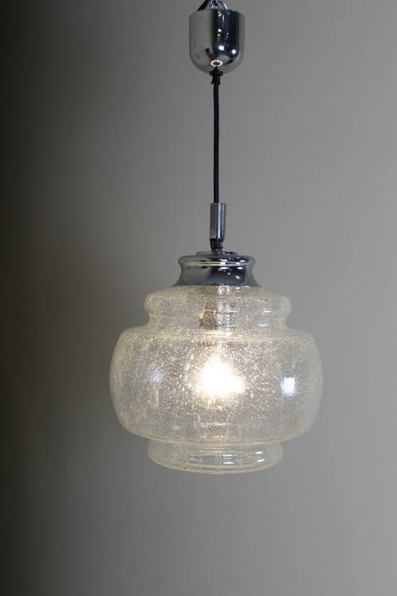 Lampada a sospensione di metà secolo, risalente agli anni '60, realizzata in vetro e cromo. Il vetro è soffiato a bocca e presenta splendide bolle che creano una luce magica. Il produttore è purtroppo sconosciuto.